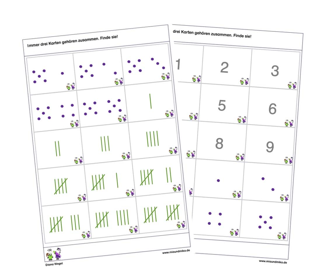 Stufe 1: Du gibst deinem Kind unsortiert die Mengenkarten. Dein Kind sortiert die Mengenkarten - immer drei Karten zusammen bilden eine Dreiergruppe.